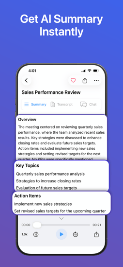 This is where the app has a strong appeal for busy professionals and students. Instead of replaying long audio files, users can move straight to overviews, key points, and next steps.